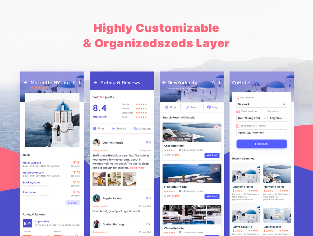 Any application needs a good start, and we’re happy we can provide you with it! Let your customers fall in love with your Booking Hotel Application from the first sight and let it stay on the top with high-quality content and absolutely vibrant design — these hero UI Kit are responsible for it.